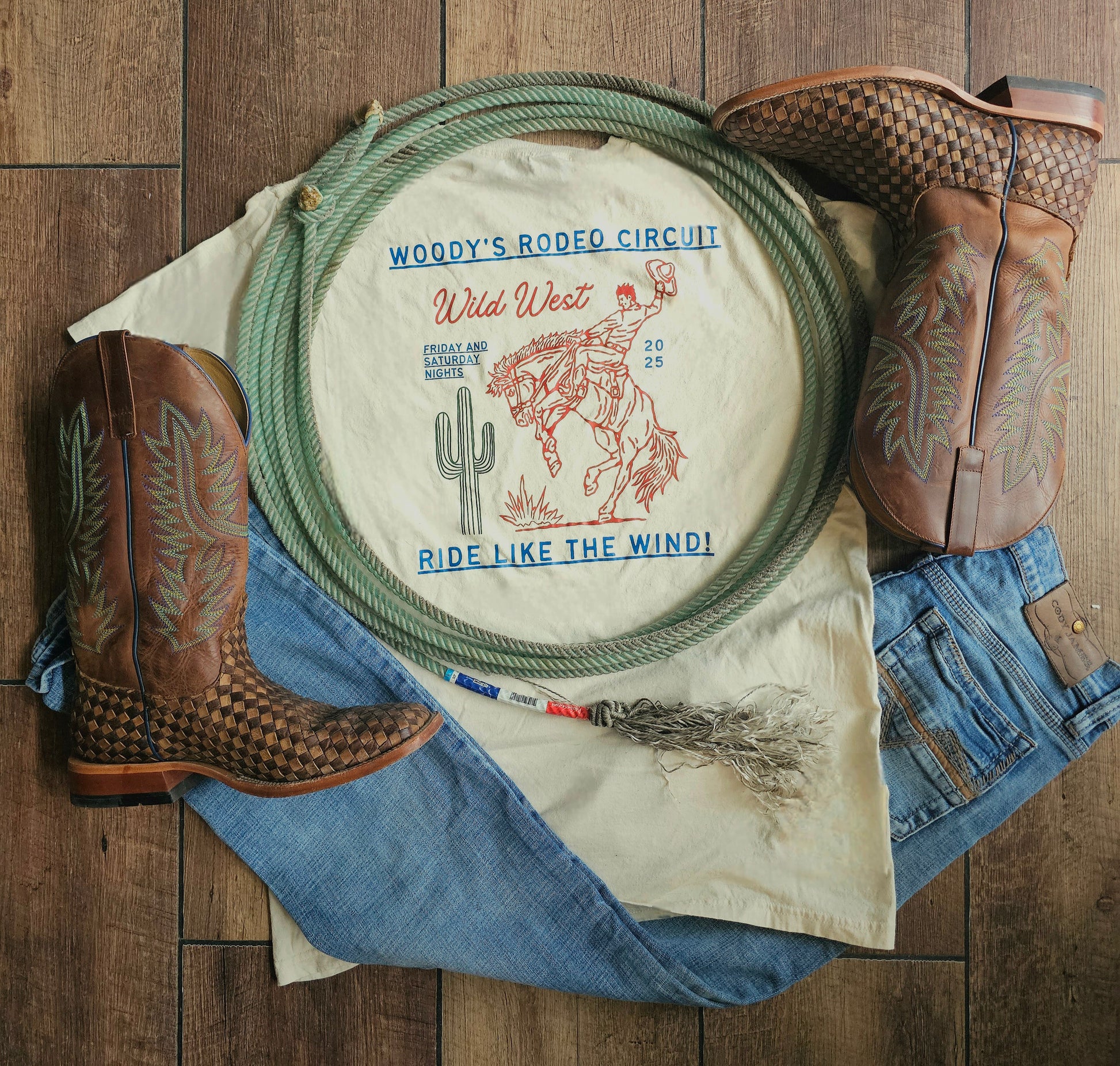 This vintage rodeo graphic tee is the go-to gear for snack-wranglers, coaster cowpokes, and anyone who’s ever taken a toddler elbow to the shin while chasing a turkey leg through the wild frontier. Featuring classic Western typography and sun-faded graphics, this soft, durable shirt blends ranch-ready style with theme park mischief. Whether you're corralling crowds, side-eyeing parade ropes, or mucking out your day with a churro in hand, it delivers rodeo grit, snack-stand charm, and maximum crowd-dodging comfort. Perfect for theme park fans, retro Western lovers, and everyday adventurers! This graphic is added to an unbleached cotton shirt that is cream with some darker fibers mixed in and is only available in S-3XL due to supplier availability.